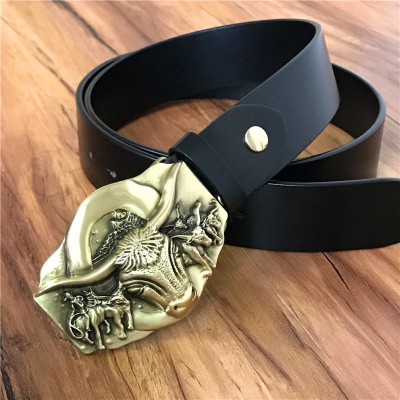 Genuine Leather Cowboy Belt Brass Bull Buckle Mens Belts Luxury Men Belt Vintage Ceinture Homme Cinturones Male Strap MBT0389