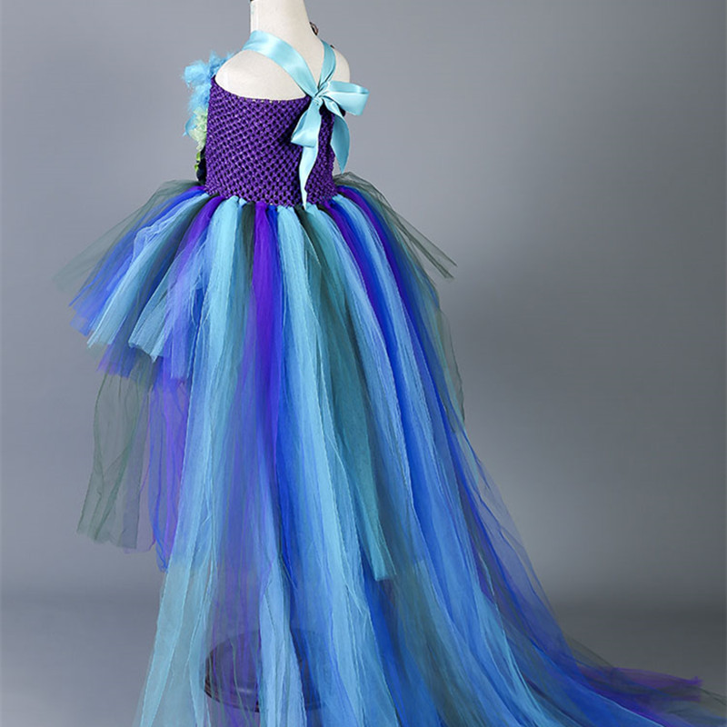 Girls Peacock Tutu Dress Long Train Tail Tulle Feathers Flowers Girl Pageant Dress Baby Kids Girls Party Birthday Dance Dresses