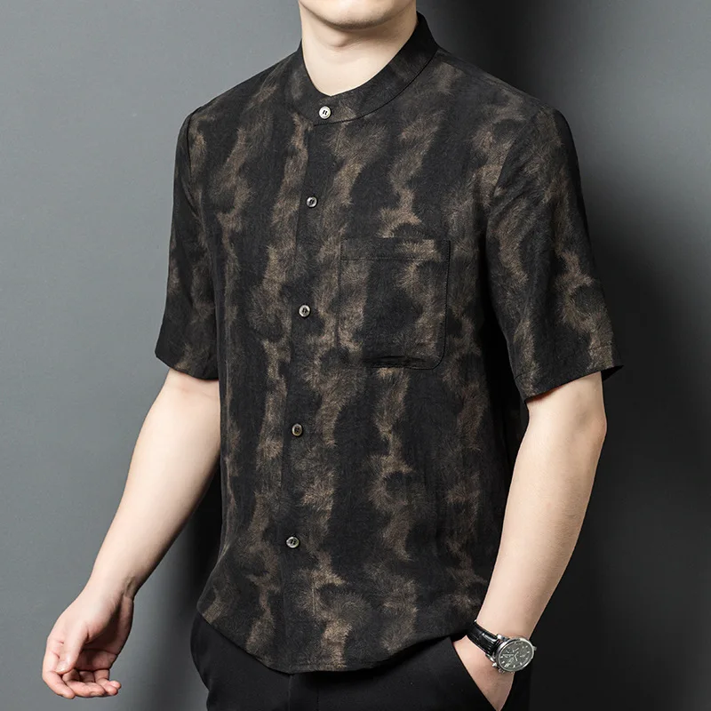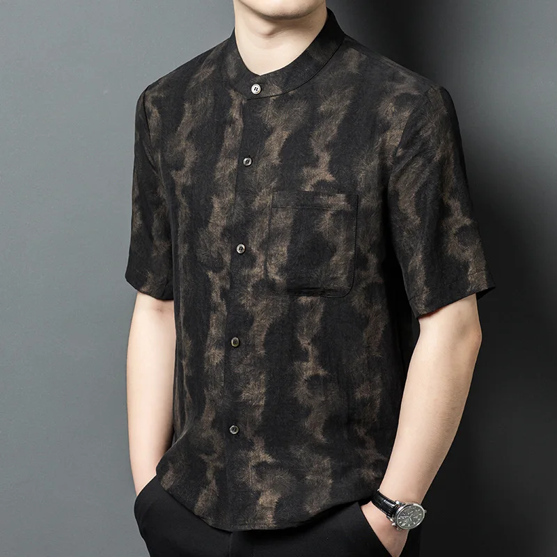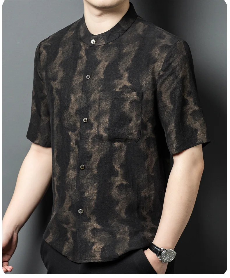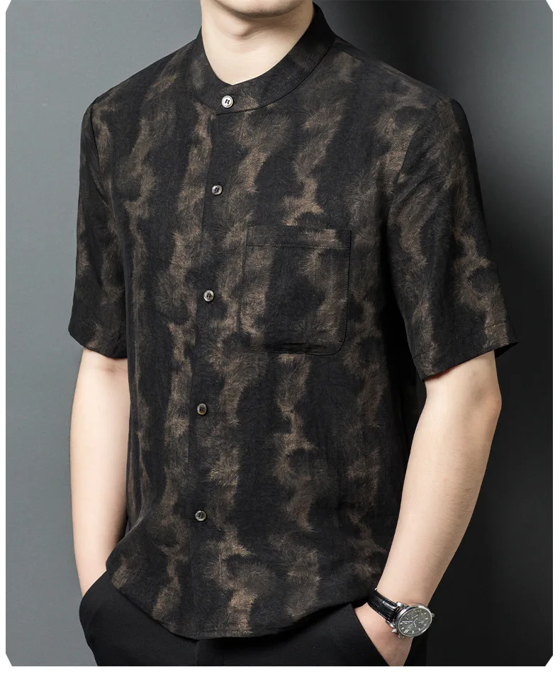 High Quality Real Silk Men’s Gambiered Guangdong Shirt Summer Thin Loose Casual Dad Wear Fashion