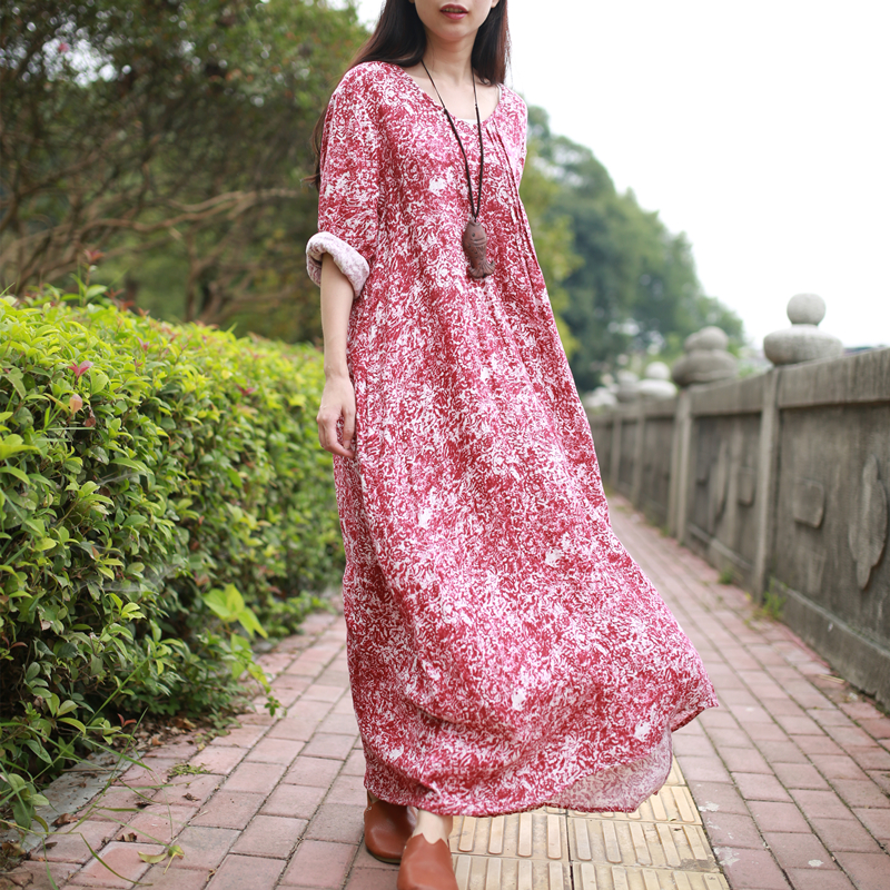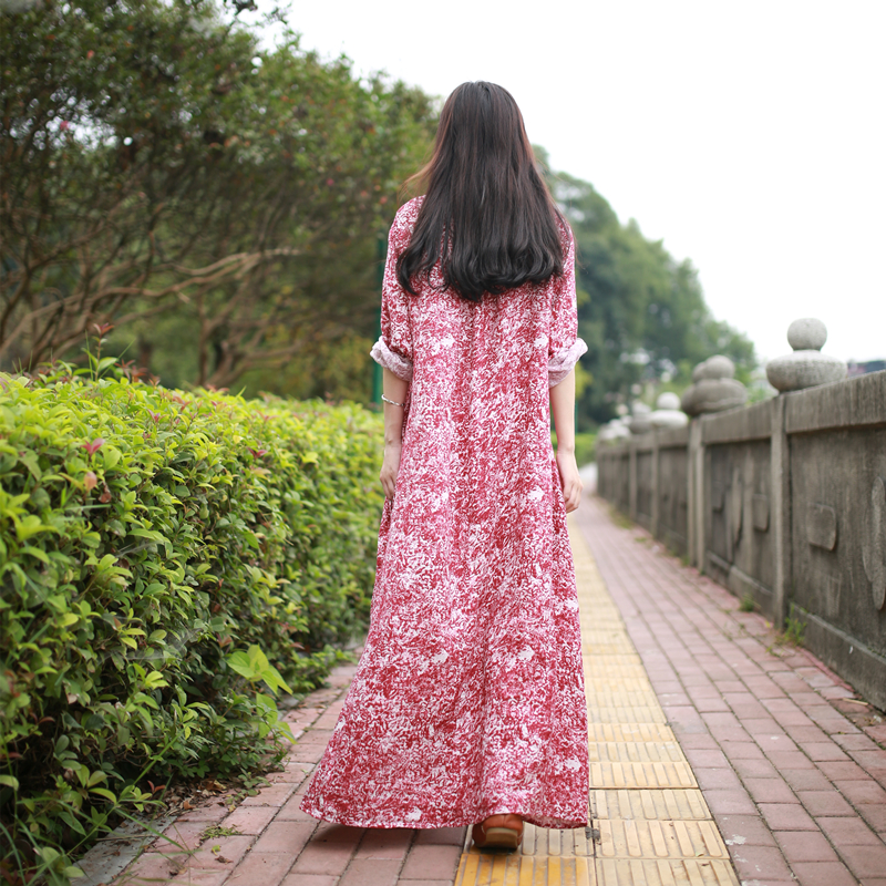 LZJN Mori Girl Long Sleeve Maxi Dress Slub Linen Casual Long Dresses V-Neck Loose Waist Robe Longue Floral Shirt Dress PX1299
