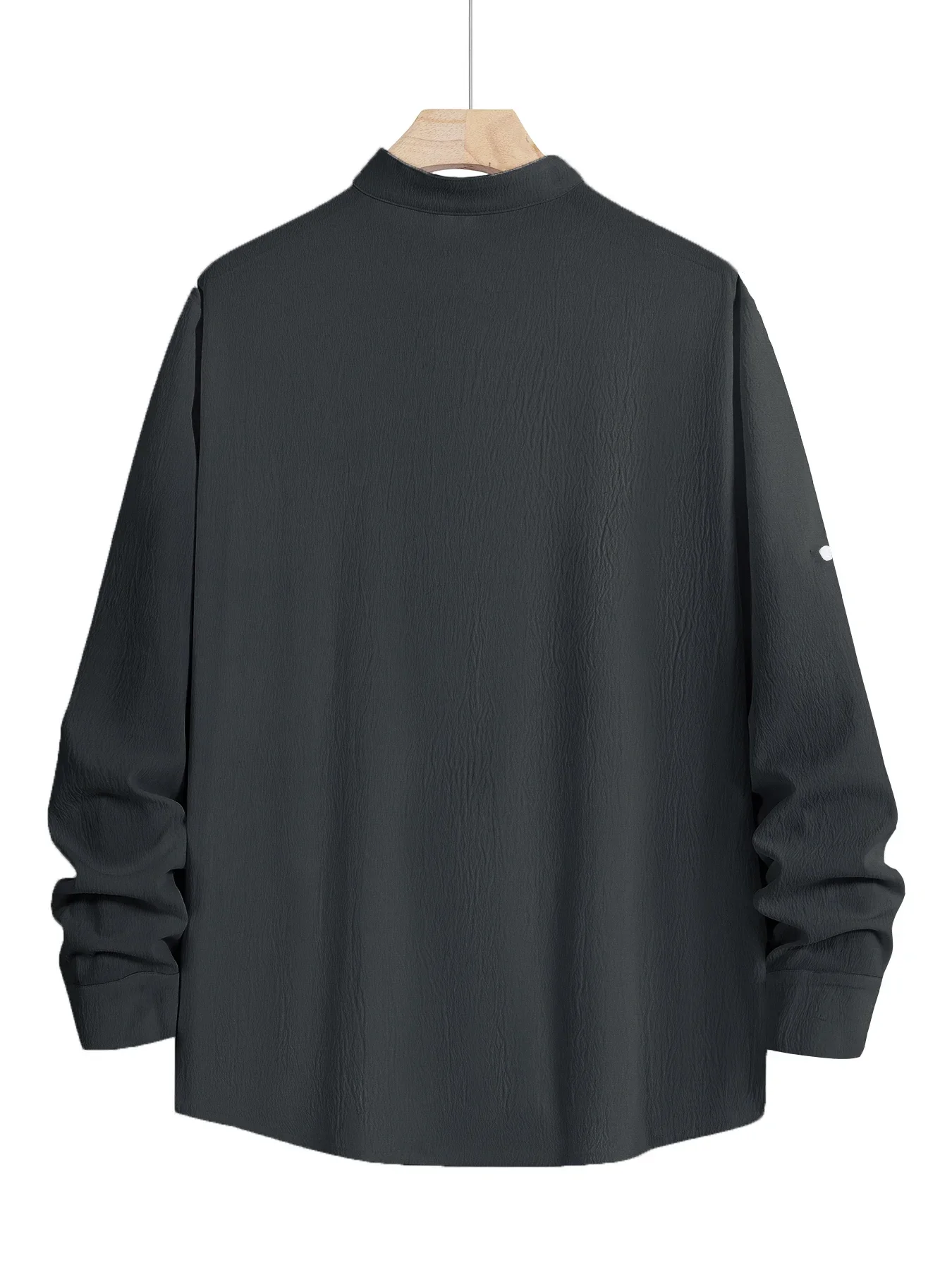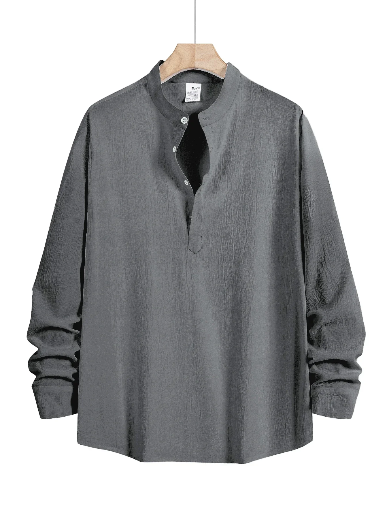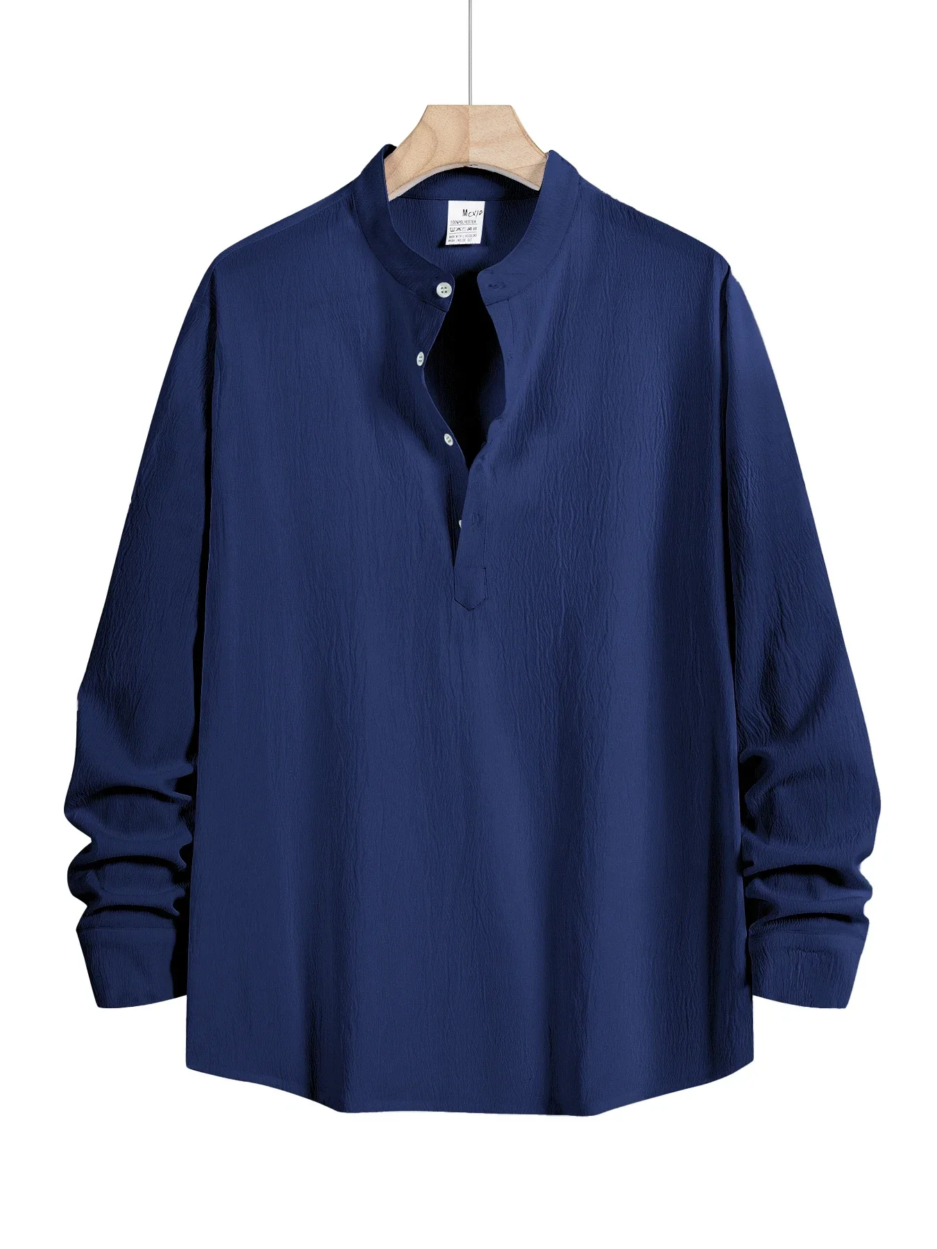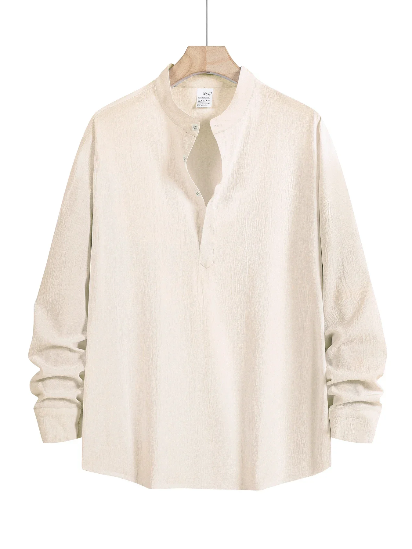 【Fashion Design】: Men’s cotton and linen Henry shirt, stand up collar, minimalist style, solid color, slim fit, long sleeves (rolled up), button closure, circular hem, featured button details.