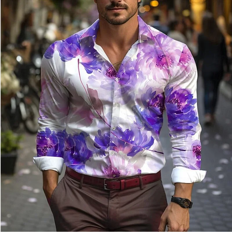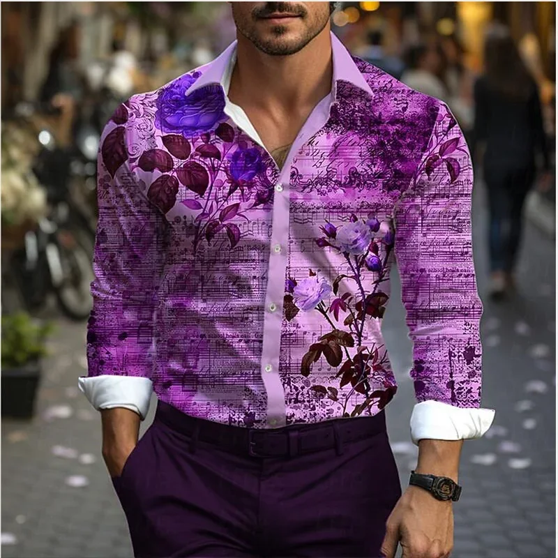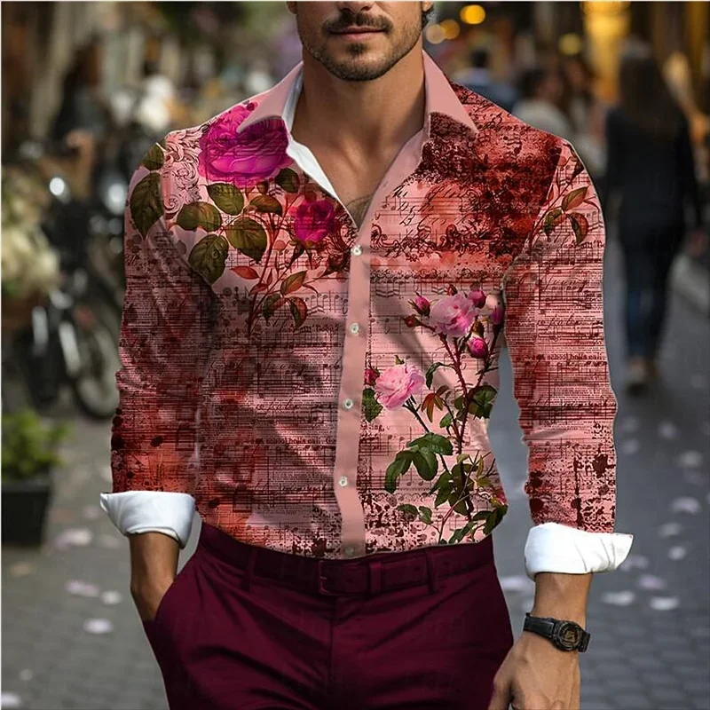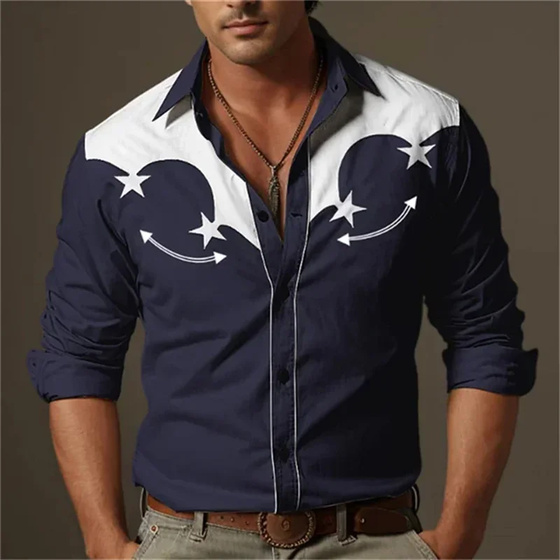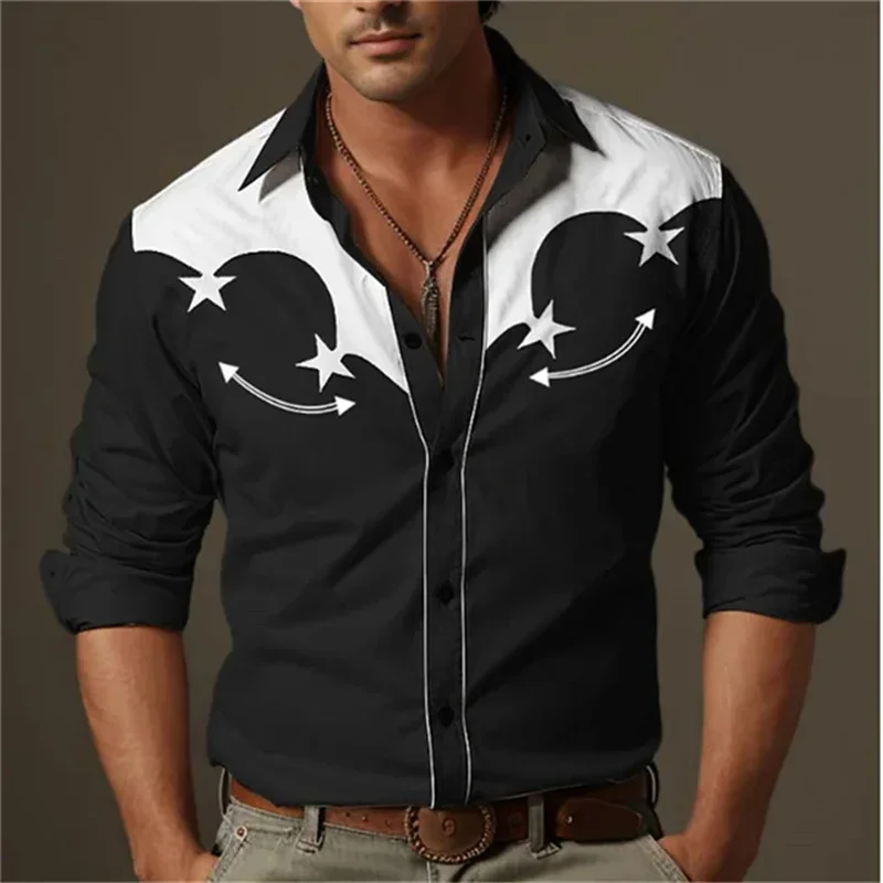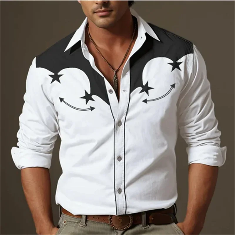 Men’s Western Shirt Vintage Pattern Lapel Long Sleeve Button Print Top Fashion Streetwear Designer Western Style