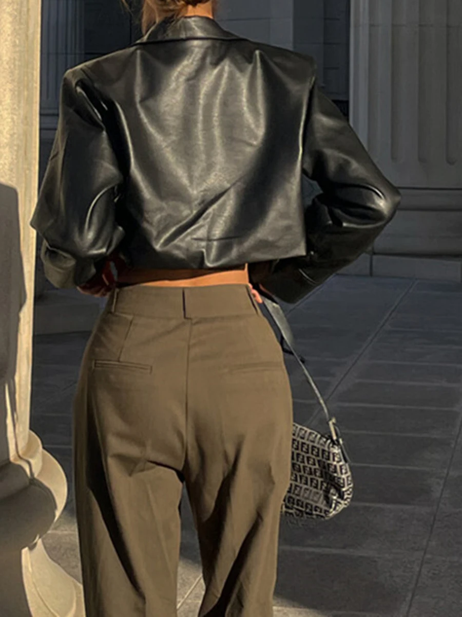 New Fashion Women Crop Leather Jacket Solid Color Casual Long Sleeve Button Down Jacket Fall Outwear Hot Sale S M L