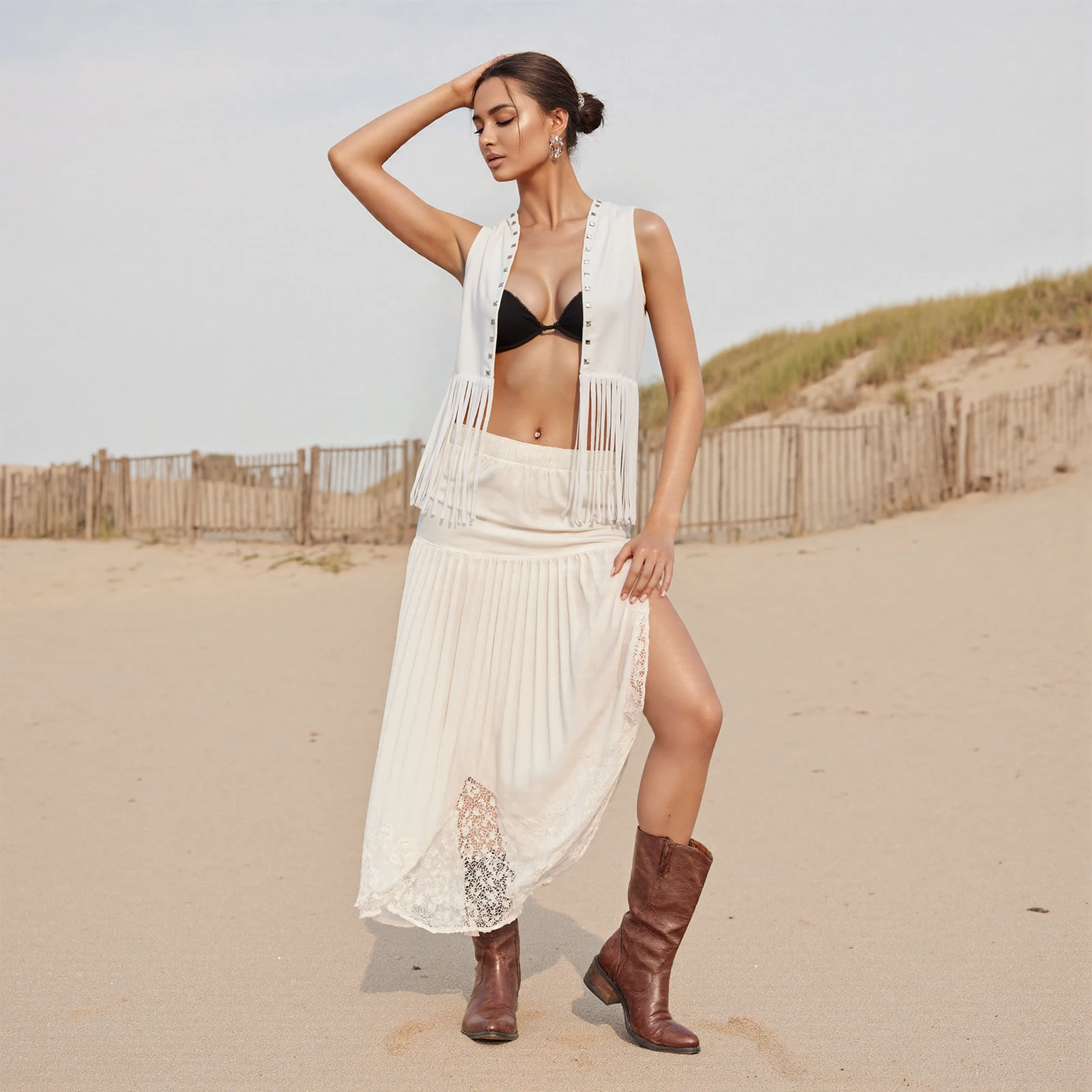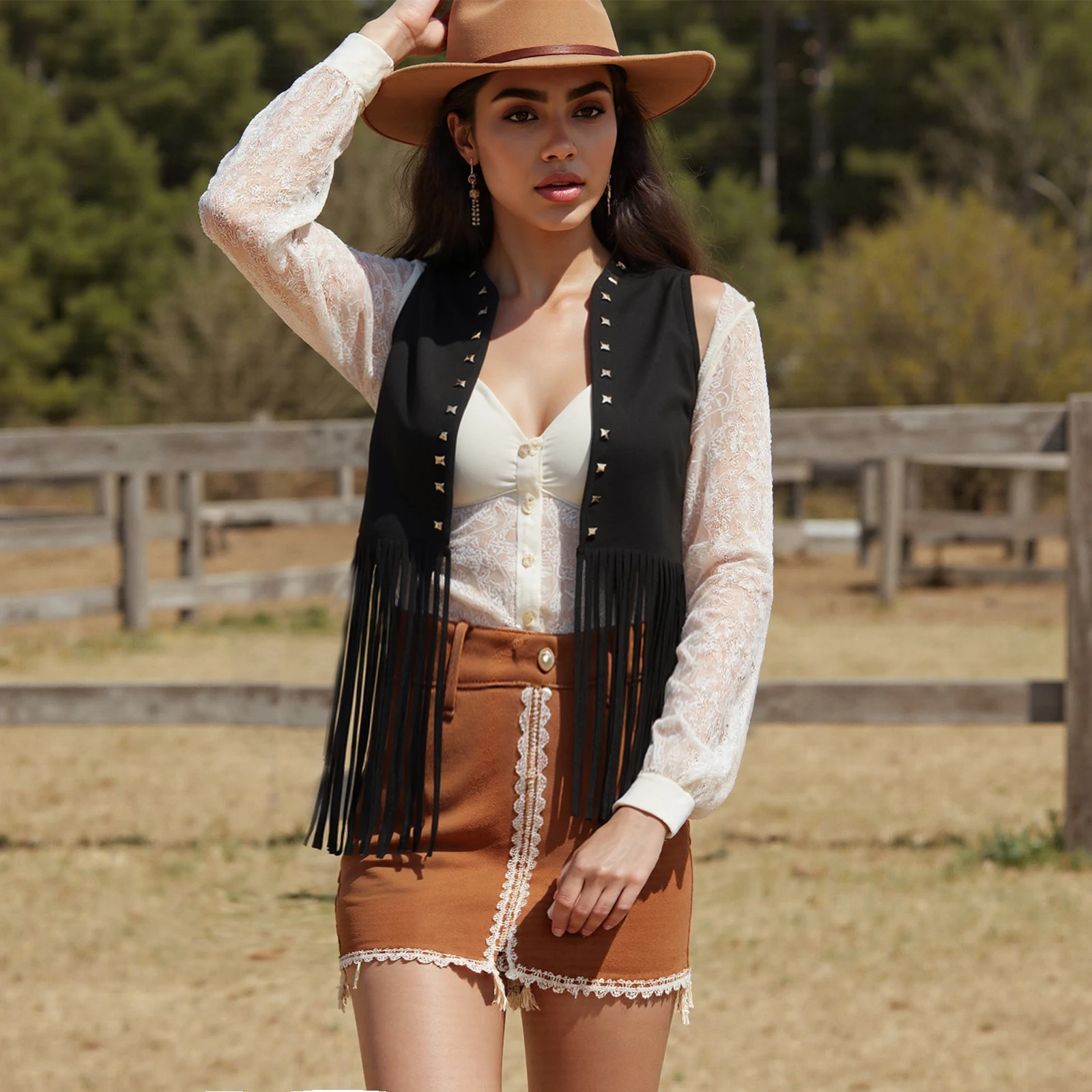 Women Rivet Tassel Vest Open Front Sleeveless Faux Suede Vest Jacket Hippie Costumes