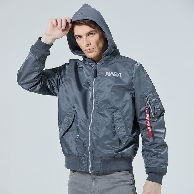 Lightweight flight jacket with hood and reflective print