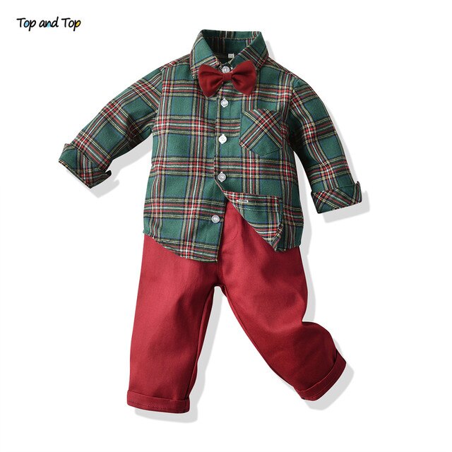 Top and Top Fashion Plaid Style Autumn Winter Boys Casual Clothes Long Sleeve Bowtie Shirt+Suspender Pants Gentleman Outfit Tuxedo