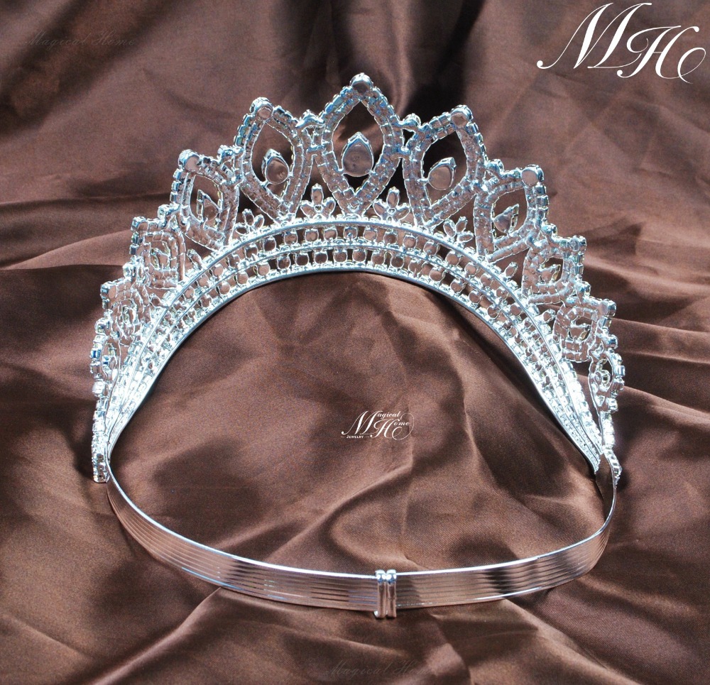 Description: You are looking at a Vintage tiara crown. Glittery Clear Austrian rhinestones are set on Silver-plated metal. All rhinestones sparkle a lot and are prong set by hands! With adjustable full band. This tiara is full of sparkle! It is perfect for pageant, wedding, prom, party, costumes or any special occasions. Thanks for looking! Size: Front center is approx. 3.5"(8.5cm) in Height and tiara is max 7.5"(19cm) in Diameter(Band can be adjusted to comfortable fit). Condition: Brand New Package:OOP Bags