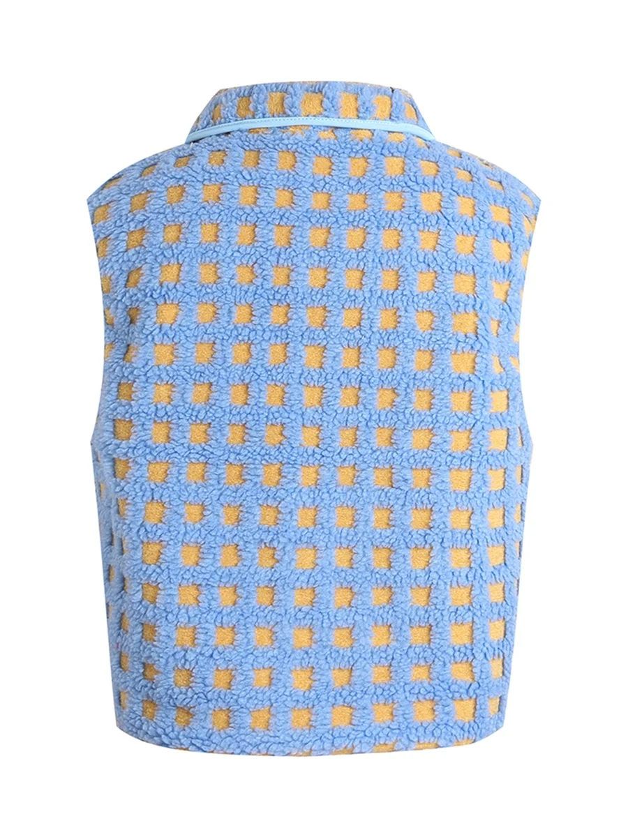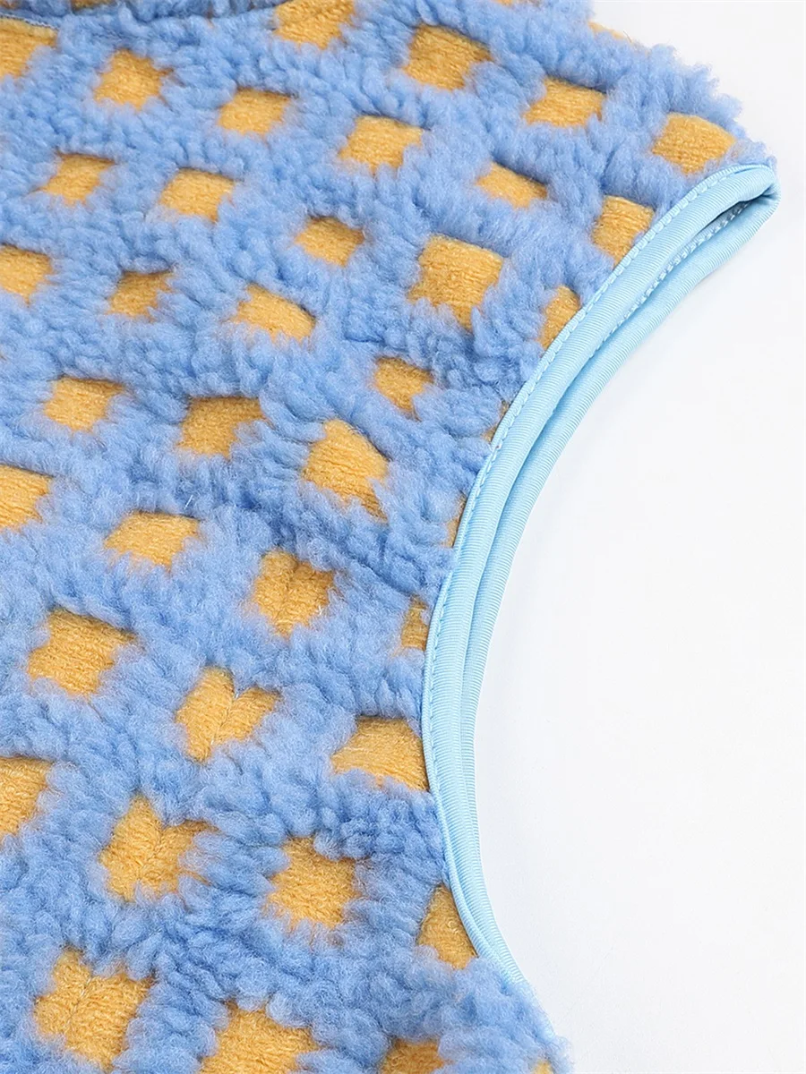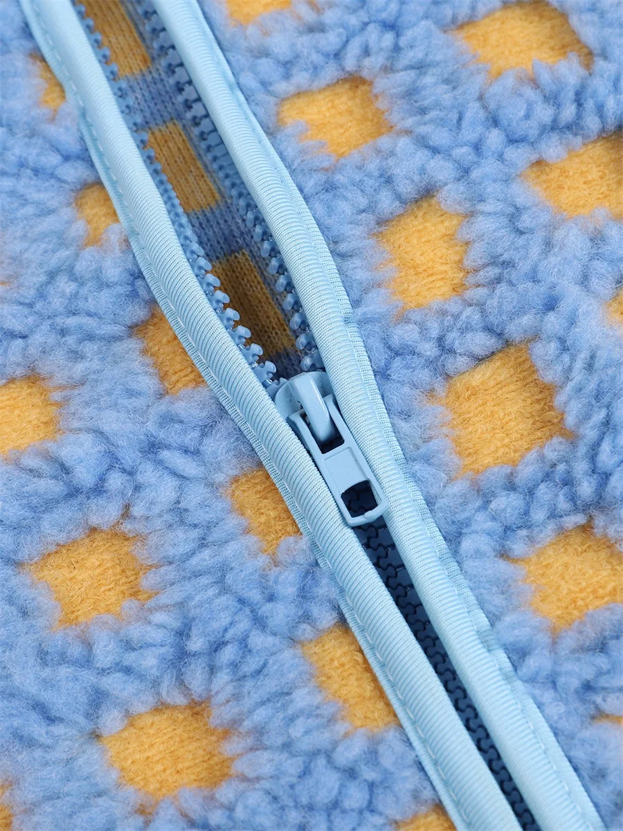 Womens Fuzzy Checkered Vest Sleeveless Stand Collar Zip Up Vest Jacket Winter Warm Outwear