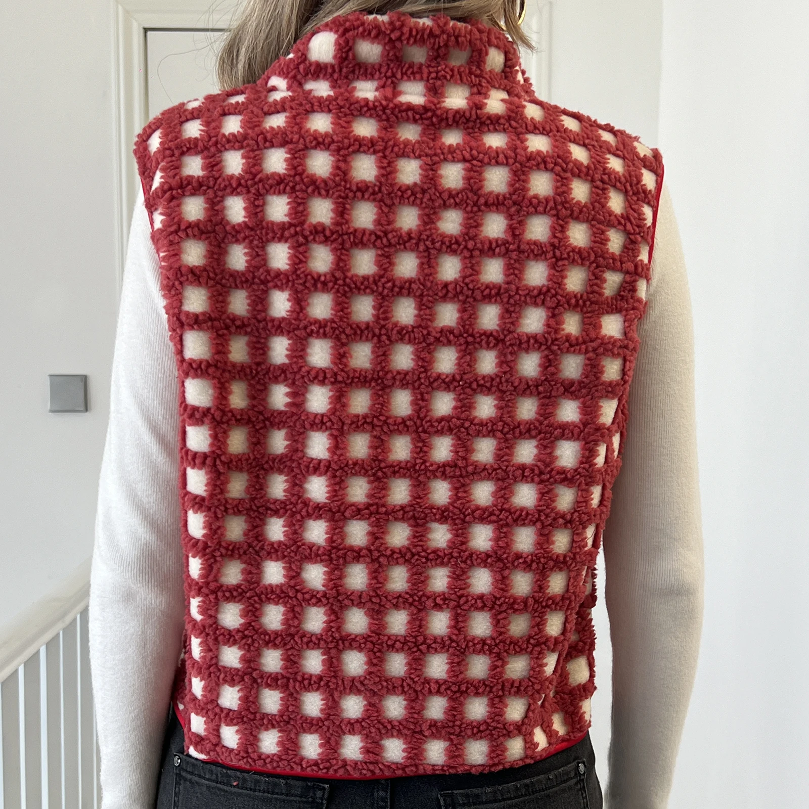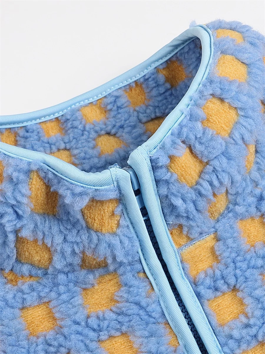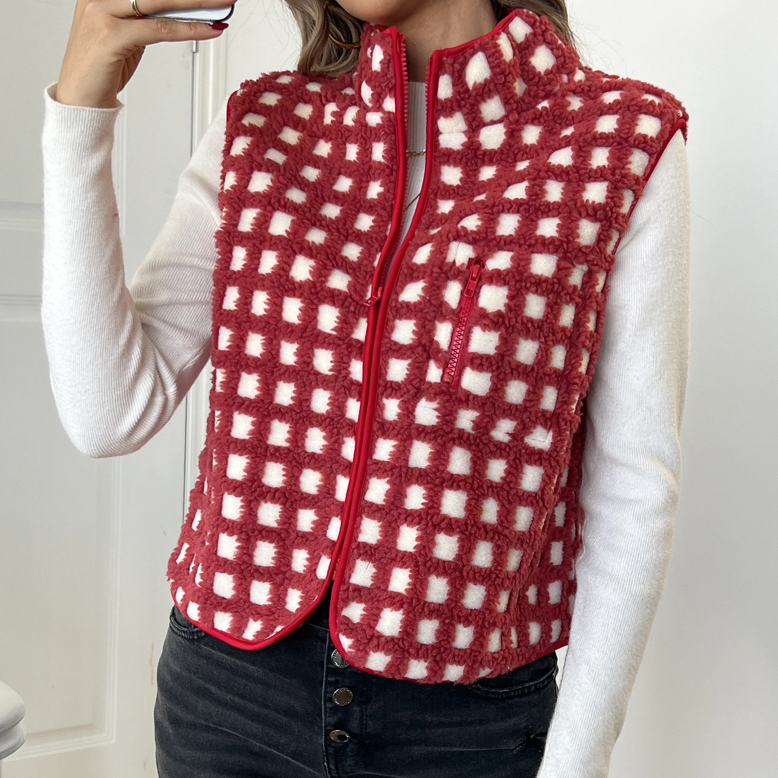 Womens Fuzzy Checkered Vest Sleeveless Stand Collar Zip Up Vest Jacket Winter Warm Outwear